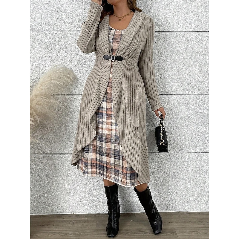 Women’s Sweater Sweater Dress Sweater Set Elegant Fashion Streetwear Plaid Ribbed V Neck Patchwork Print Long Sleeve Long Tops Knit Outdoor Daily Week