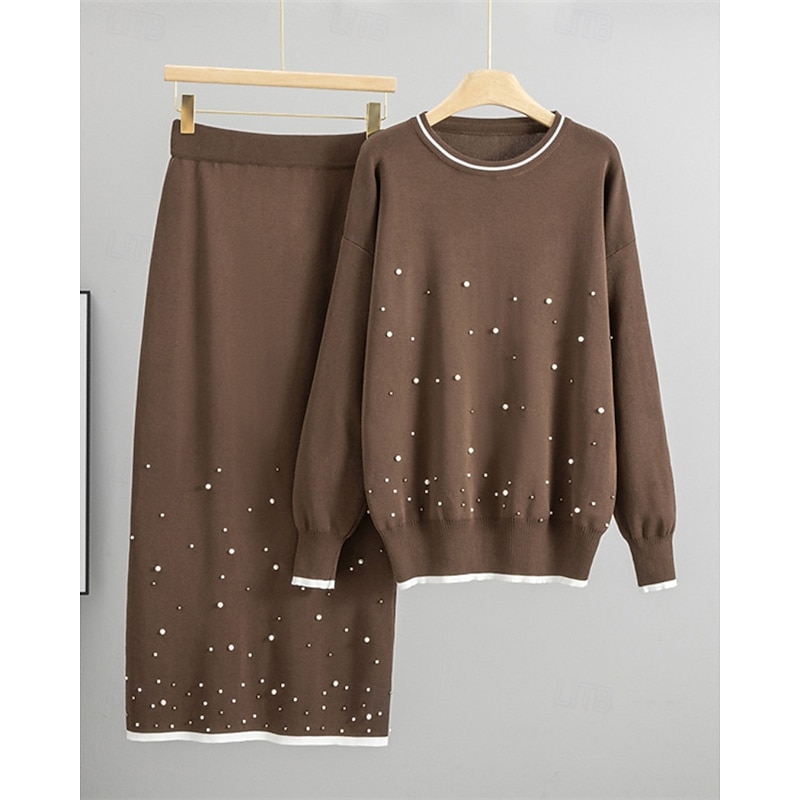 Women’s Sweater Sweater Co-ords Streetwear Casual Color Block Crew Neck Beaded Knitted Long Sleeve Regular Tops Knit Daily Holiday Going out Black Apr